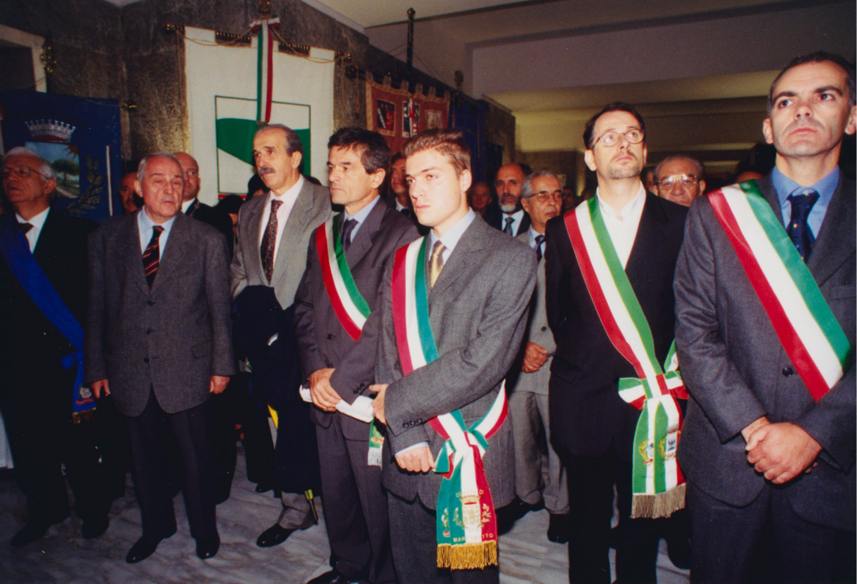 In apertura: commemorazioni dell’eccidio di Monte Sole, interno del Sacrario ai Caduti. Si distinguono da sinistra Dante Cruicchi, Renzo Imbeni, Sergio Chiamparino, Andrea De Maria, Andrea Marchi. Marzabotto, 30 settembre 2001.